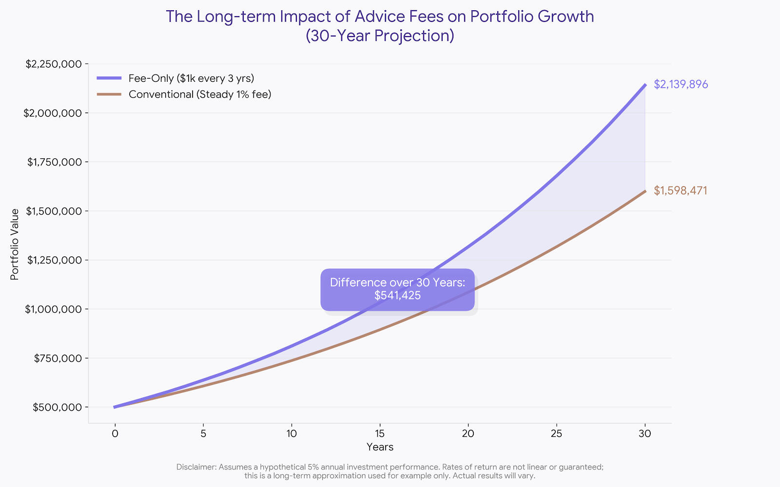 Many Canadians assume their financial advice is low-cost because the fees are often tucked inside their investment products. If you are with a conventional firm, you are likely paying 1% or more of your total portfolio every year — not for the investments themselves, but specifically for "advice."On a $500,000 portfolio, that is $5,000 a year, regardless of whether you spoke to your advisor once or twenty times. Over 30 years, accounting for money compounding, this annual loss equates to over $540,000 compared to a fee-for-service model with a triennial plan review structure.It is akin to an accountant charging you a percentage of your total income rather than a fee for the work required to file your return. As your wealth grows, your fee increases automatically, even if the complexity of the work stays the same.Fee-only planning fixes this. By replacing asset-based percentages with a transparent, fixed fee, you only pay for the expertise you actually need. This ensures your advisor’s goals are perfectly aligned with yours — objective, honest, and focused on your growth.