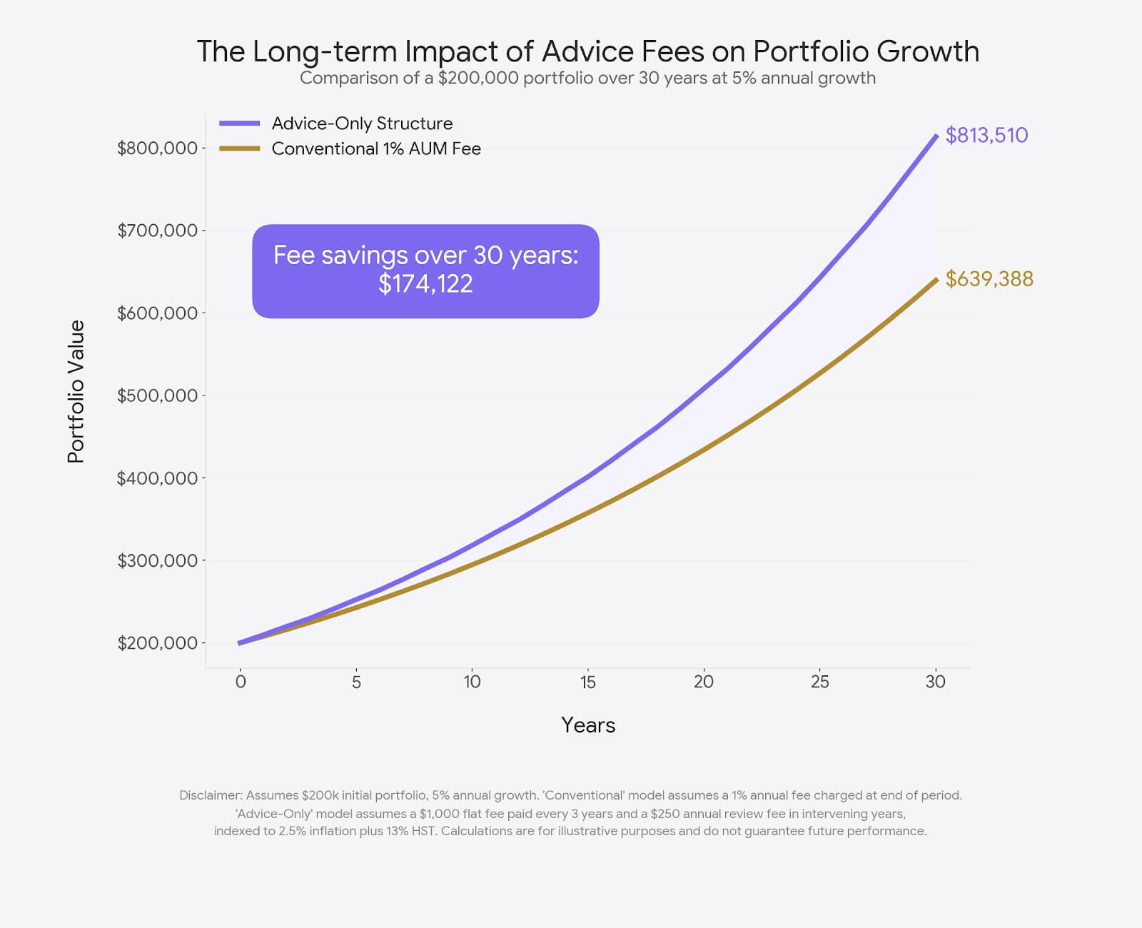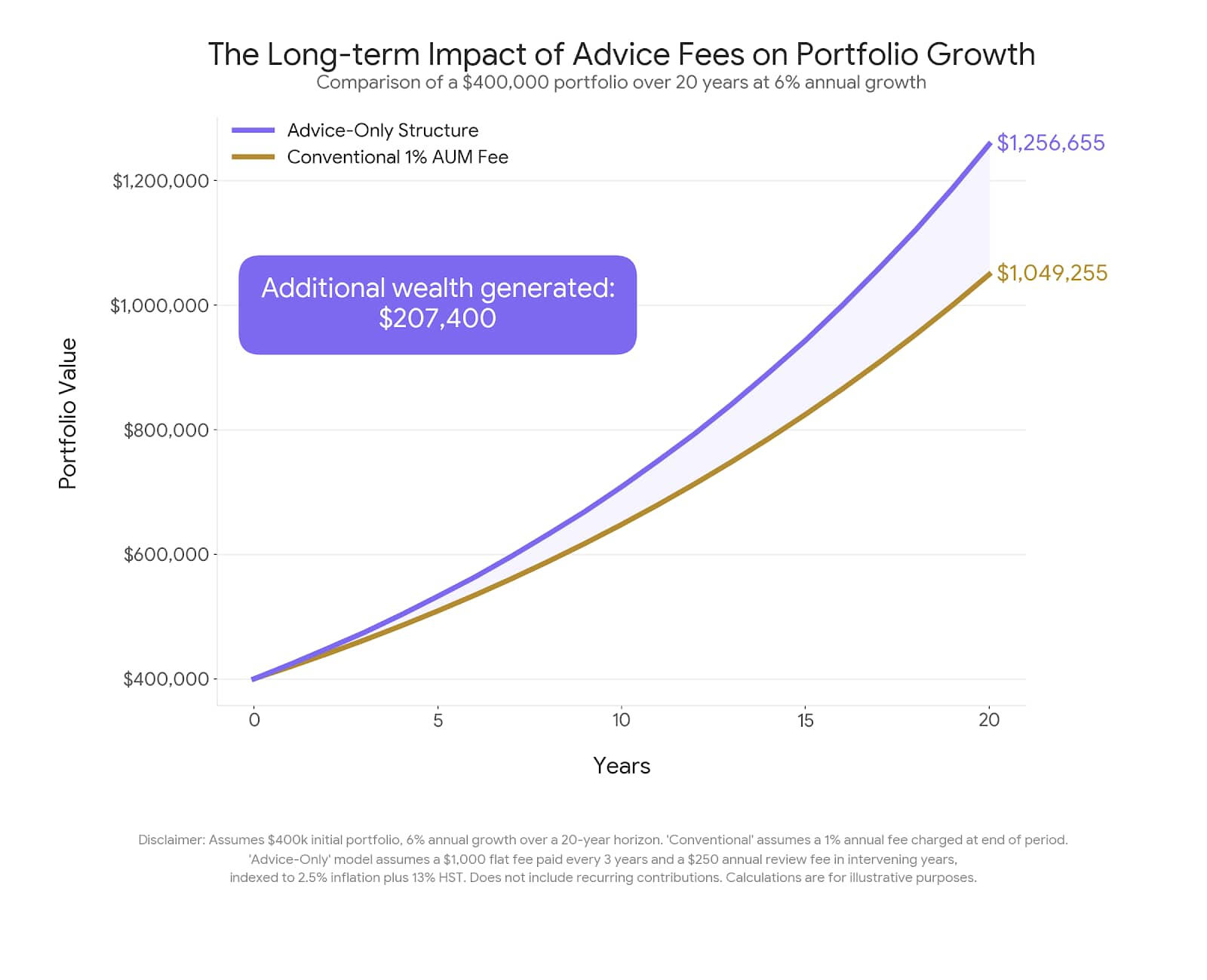 In Canada, financial advice is most commonly priced as a percentage of assets under management. A typical advisory fee is approximately 1% annually and is charged in exchange for ongoing advice, planning, and service.This advice fee, while commonly bundled with other fees, is technically separate from the investment management costs of the investments held in the portfolio. However, because this advice fee is tied to portfolio value, it increases automatically as assets grow, regardless of whether the level of advice required changes.Advice-only financial planning uses a different pricing structure. Advice is treated as a professional service and billed using transparent flat fees. Clients engage planning services only when advice is needed, rather than paying an ongoing percentage tied to asset size.Over time, these two pricing models produce materially different financial outcomes, even when the quality of advice is comparable.